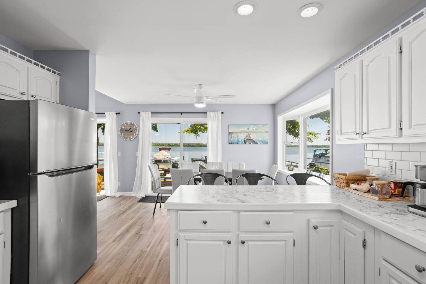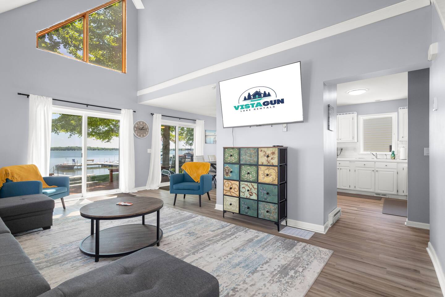Escape to Serenity Shores, a sprawling lakeside haven nestled on the tranquil shores of Gun Lake. This inviting cottage offers ample space and comfort making it the perfect retreat for families, groups of friends, or any occasion that calls for relaxation and rejuvenation.