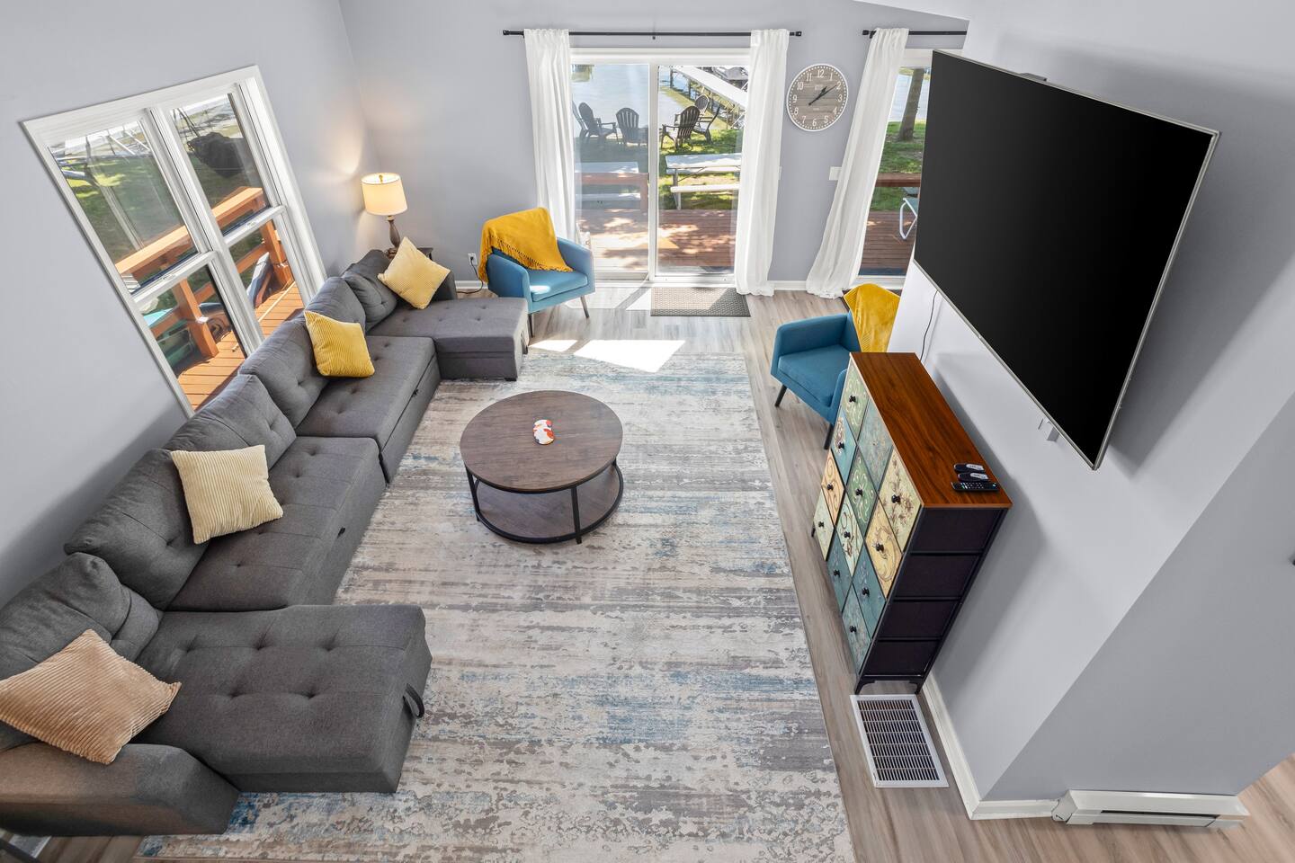 ✦Living Room✦ ✔ Smart TV ✔Coffee Table ✔Reading Lamps ✔Large Sofa ✦Kitchen - Fully equipped✦ ✔Microwave ✔Coffee Maker ✔Stove ✔Oven ✔Refrigerator/Freezer ✔Toaster ✔Drinkware ✔Silverware ✔Wine and Whisky Glasses ✔Pots & Pans ✔Knife Set & Cutting Board ✔Salt & Pepper ✔Dining Table and Smart TV ✦Outdoor Amenities✦ ✔Patio space with Grill and grilling utensils ✔Fire Pit and Seating ✔Serene Lakeside Views ✔Kayaks ✔Boat Rentals ✔Shallow Sand Bar Lake perfect for swimming and lounging ✦Bedroom 1✦ ✔Luxury Memory Foam King-Size Bed w/ Extra Pillows! ✔Night Stands w/ Reading Lamps ✔Closet space w/ Hangers and Shelves ✔Smart TV ✔Blackout Curtains ✔Lake Views ✦Bedroom 2✦ ✔Luxury Memory Foam King-Size Bed w/ Extra Pillows! ✔Night Stands w/ Reading Lamps ✔Closet space w/ Hangers and Shelves ✔Smart TV ✦Bedroom 3✦ ✔2 Luxury Memory Foam Double-Size Beds ✔Night Stands w/ Reading Lamps ✔Closet space w/ Hangers and Shelves ✔Smart TV ✦Bedroom 4✦ ✔2 Sets of Bunk Beds (2 Full Mattresses Each) ✔Night Stands w/ Reading Lamps ✔Smart TV ✔Wardrobe Storage ✦Bathroom 1✦ ✔Bath w/ a Shower ✔Toilet ✔Sink ✔Mirror ✔Towels ✦Bathroom 2✦ ✔Bath w/ a Shower ✔Toilet ✔Sink ✔Mirror ✔Towels ✦Laundry Room✦ ✔Washing Machine ✔Dryer